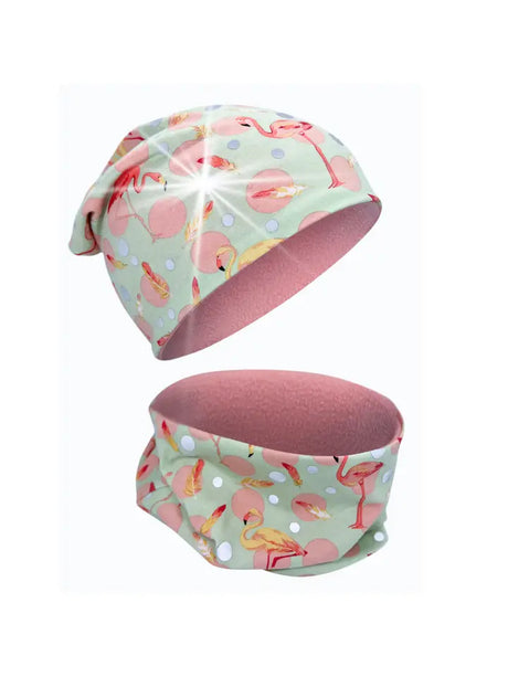 Kinder Winter Mütze & Loop Schal Reflektierend Flamingo