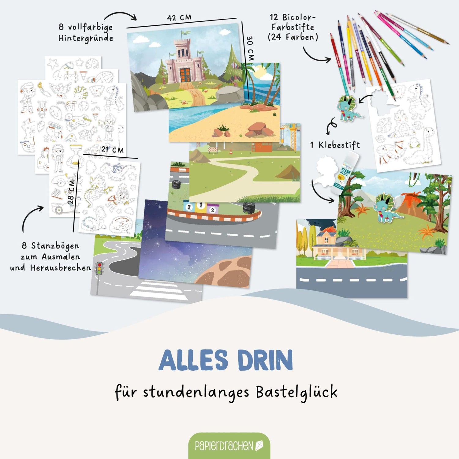 Acht Stanzbögen (28 x 21 cm) mit zauberhaften Motiven lassen sich spielerisch herausbrechen und ausmalen, während acht grossformatige Hintergründe (42 x 30 cm) fantastische Kulissen bieten. Die zwölf Bicolor-Farbstifte (24 Farben) und der kompakte Klebestift ermöglichen vielfältige Gestaltungsideen.