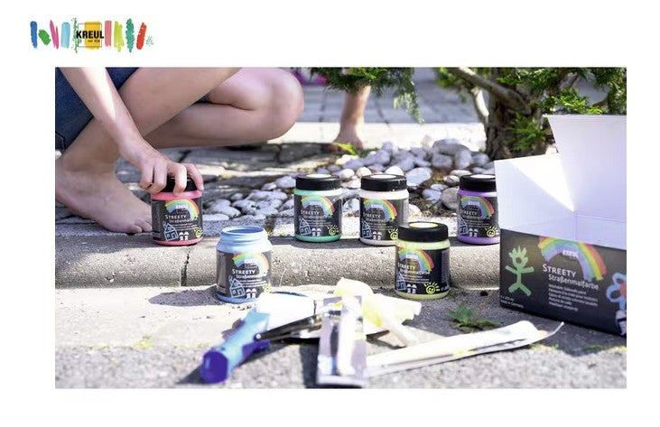 Wer sagt denn, dass Kunstwerke nur auf Papier gehören? Weg mit klein und quadratisch: Ab sofort wird im XXL-Format gemalt. Die neue Leinwand für coole Kids ist der Gehweg vor dem Haus! Denn hier ist der Platz unendlich. Was passt da besser als Farbe, die richtig ins Auge springt? Vorhang auf für die KREUL Streety Strassenmalfarbe, die intensiv leuchtet und mit dem Pinsel auf den Asphalt aufgetragen wird. Coole Werke auf dem eintönigen Grau, aber nicht für die Ewigkeit. Mit Wasser löst sich die satte Farbe wieder ab. Was der Regen nicht schaff t, erledigt der Gartenschlauch. Selbstverständlich ist die Kreide ohne bedenkliche Inhaltsstoffe. Denn zeitgemässe Kinder-Kunst soll Spass machen und nachhaltig sein – auch wenn sie vergänglich ist. Aus den meisten Textilien lässt sich die Farbe ab 30 Grad wieder herauswaschen. Es kann aber vorkommen, dass die Farben nicht bei allen Textilien restlos entfernt werden kann. Daher entsprechende Malkleider anziehen.