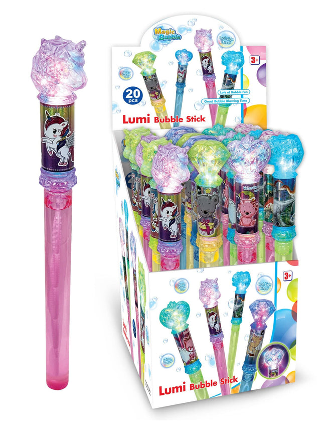 Cooler Lumi-Seifenblasenstick von Magic Bubble mit Lichteffekten. 4 Sujets (Dino, Einhorn, Herz und Diamant) in verschiedenen Farben assortiert. Inklusive 130 ml hochwertiger Seifenblasenflüssigkeit.