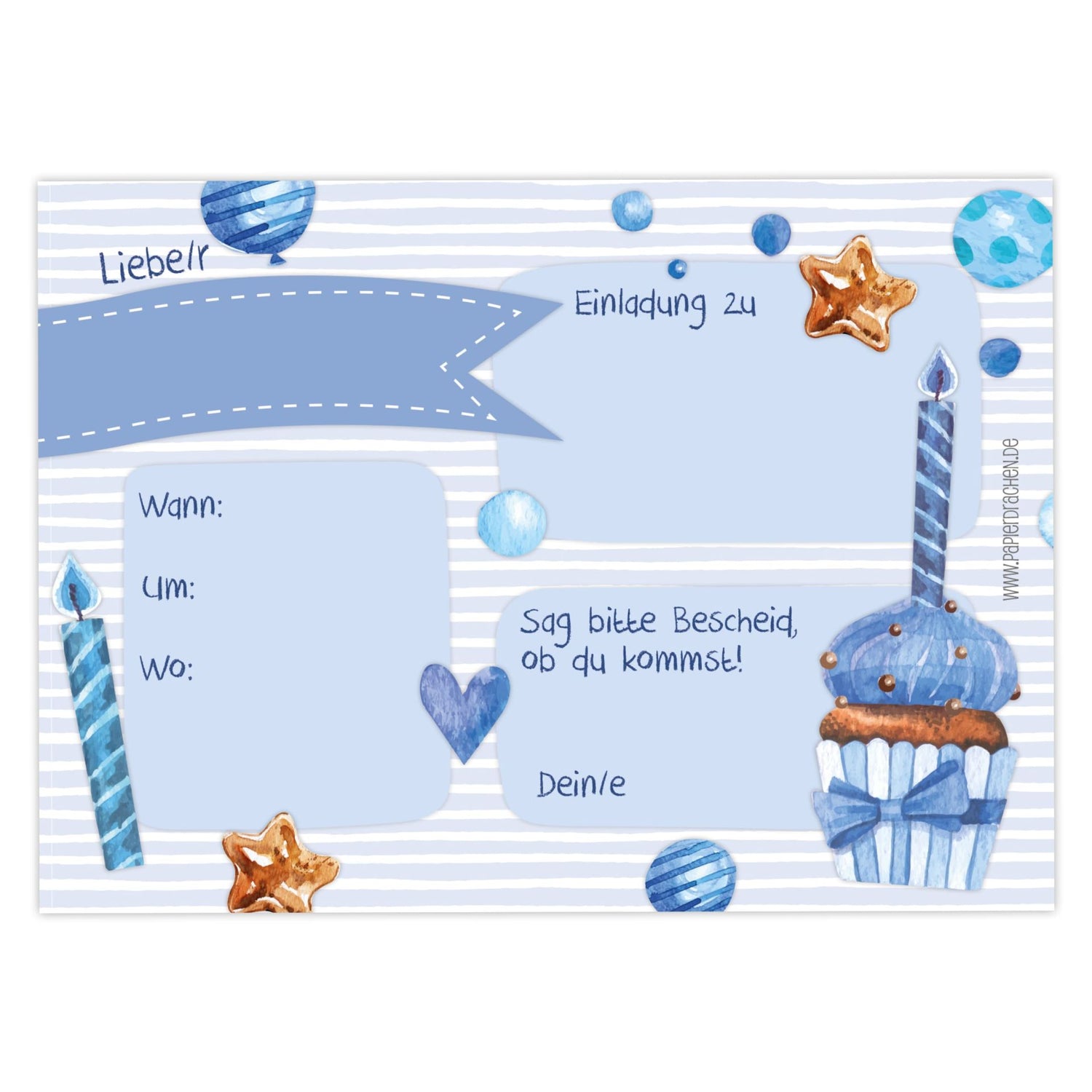 ☆ Lieferumfang: 12 süße Einladungskarten – Motiv Muffin Blau – DIN A6 (300g/m² Kartonpapier – in Deutschland hergestellt)