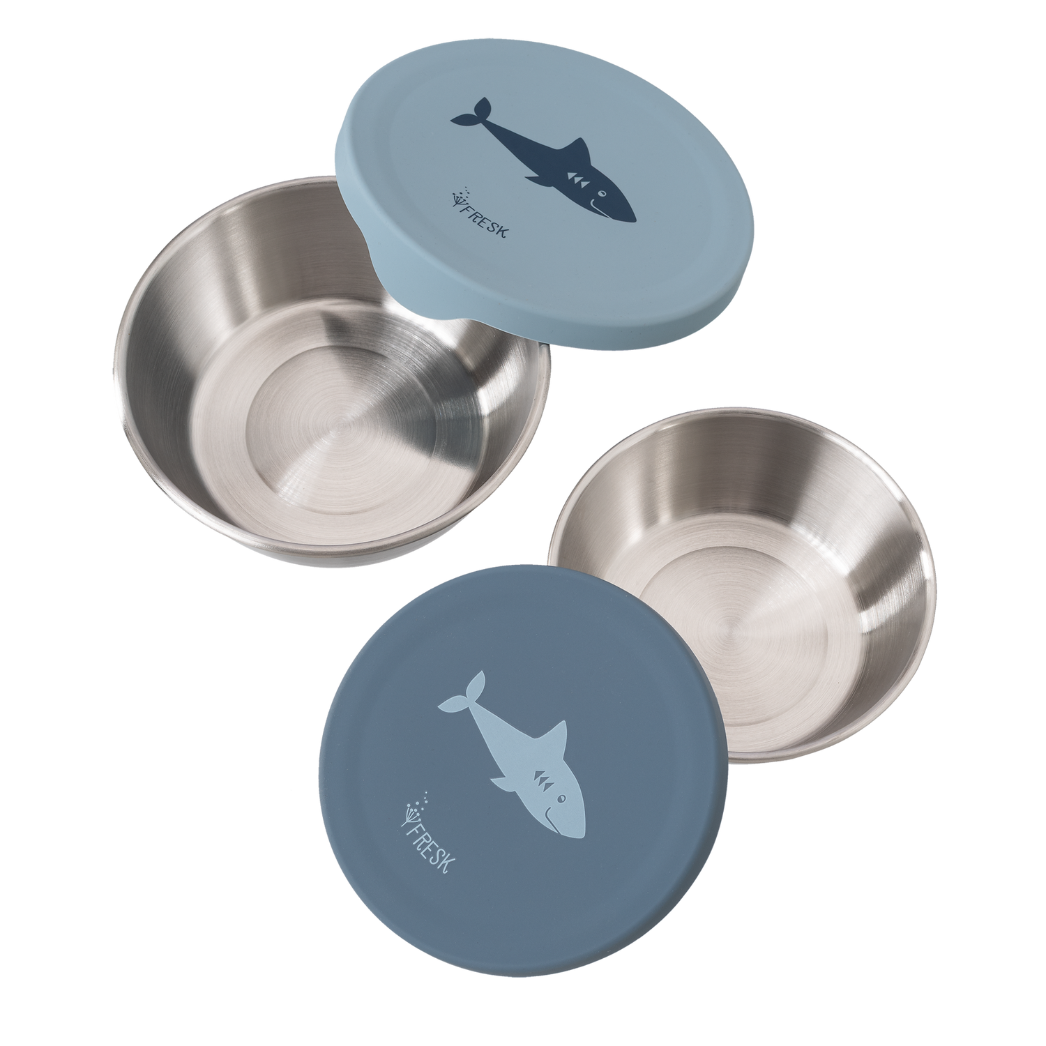 Die beiden Behälter sind aus robustem Edelstahl gefertigt und haben einen praktischen Silikondeckel. Der Stahlboden sorgt dafür, dass weder Farbe noch Geruch des Inhalts aufgenommen werden, und der flexible Silikondeckel lässt sich auch von kleinen Kinderhänden leicht öffnen. Da die Snackboxen ineinander passen, nehmen sie wenig Platz in der Küchenschublade ein. Spülmaschinenfest, daher leicht zu reinigen!