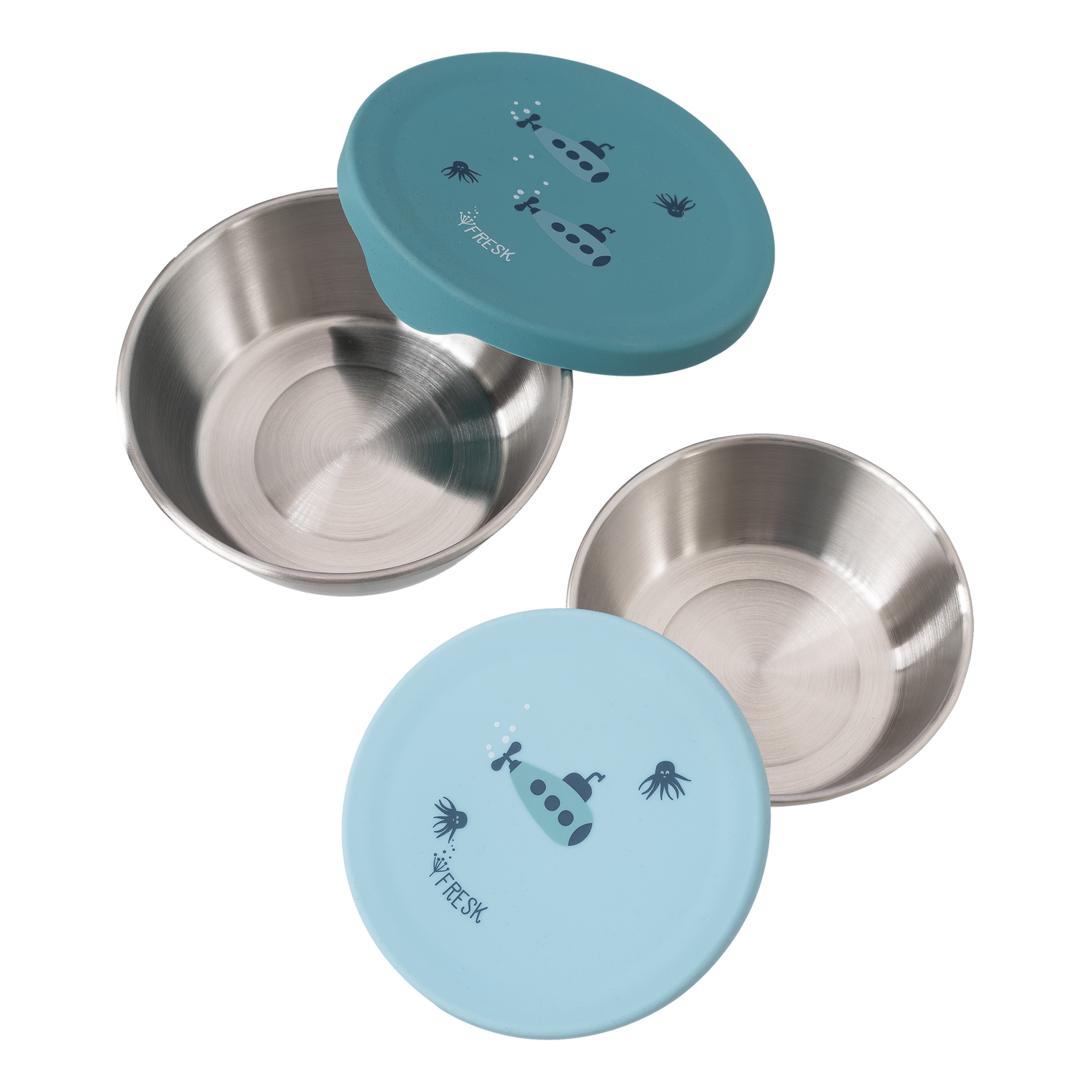 Die beiden Behälter sind aus robustem Edelstahl gefertigt und haben einen praktischen Silikondeckel. Der Stahlboden sorgt dafür, dass weder Farbe noch Geruch des Inhalts aufgenommen werden, und der flexible Silikondeckel lässt sich auch von kleinen Kinderhänden leicht öffnen. Da die Snackboxen ineinander passen, nehmen sie wenig Platz in der Küchenschublade ein. Spülmaschinenfest, daher leicht zu reinigen!