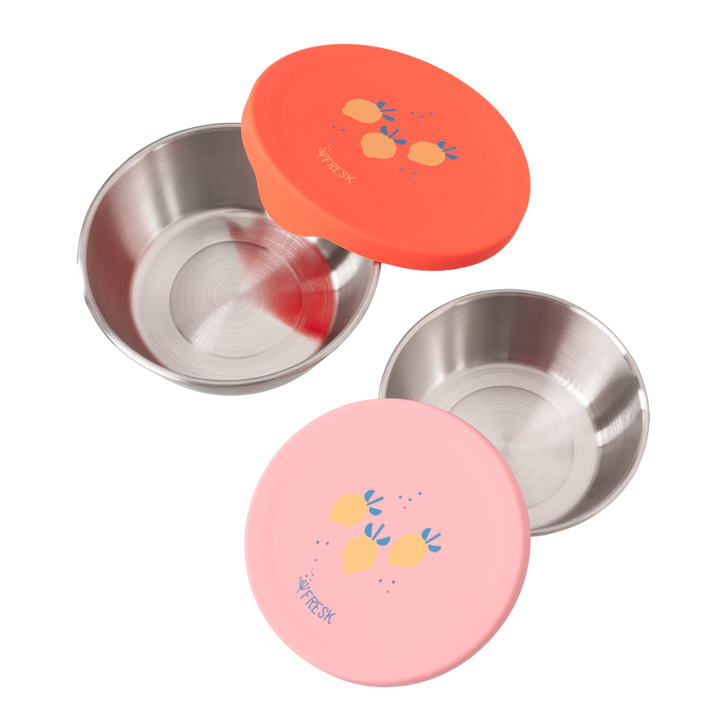 Die beiden Behälter sind aus robustem Edelstahl gefertigt und haben einen praktischen Silikondeckel. Der Stahlboden sorgt dafür, dass weder Farbe noch Geruch des Inhalts aufgenommen werden, und der flexible Silikondeckel lässt sich auch von kleinen Kinderhänden leicht öffnen. Da die Snackboxen ineinander passen, nehmen sie wenig Platz in der Küchenschublade ein. Spülmaschinenfest, daher leicht zu reinigen!