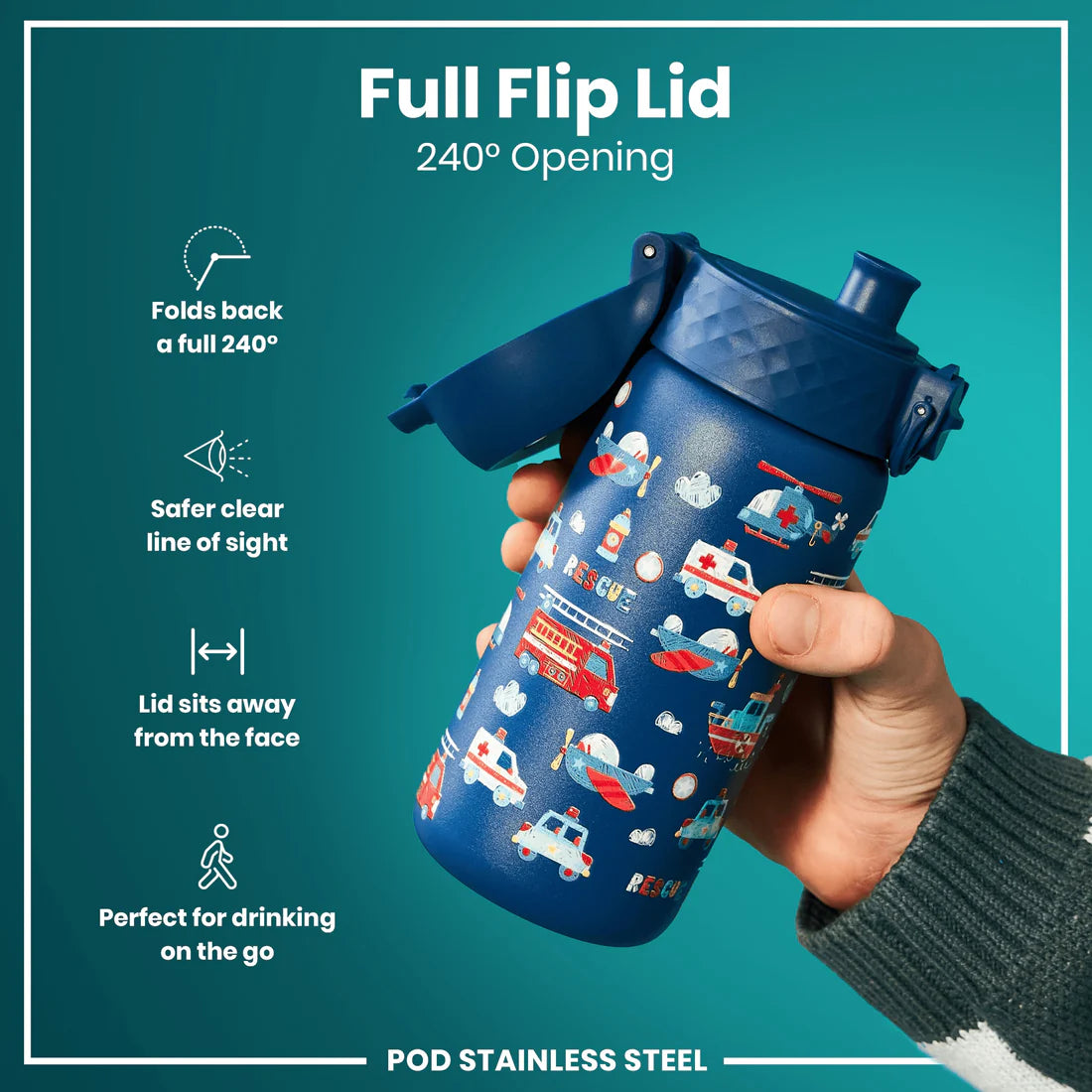 Die Edelstahl Trinkflasche für Kinder von Ion8 mit 400ml Volumen ist auslaufsicher, leicht und kinderleicht zu öffnen dank dem aufklappbaren Deckel mit Trinkloch. Zusätzlich hat es einen Halterungshaken um das Tragen noch angenehmer zu machen.