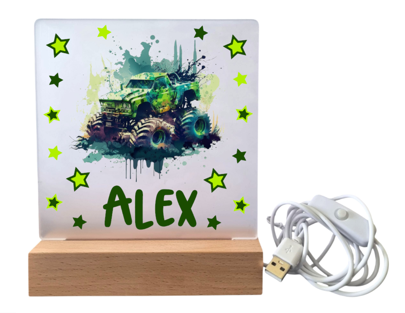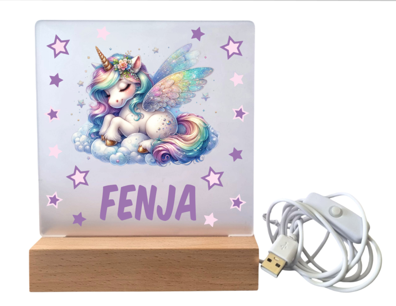 Das Nachtlicht aus Holz und Plexiglas für Kinder kann mit Name oder nach Wunsch mit UV-DRUCK bedruckt / personalisiert werden.