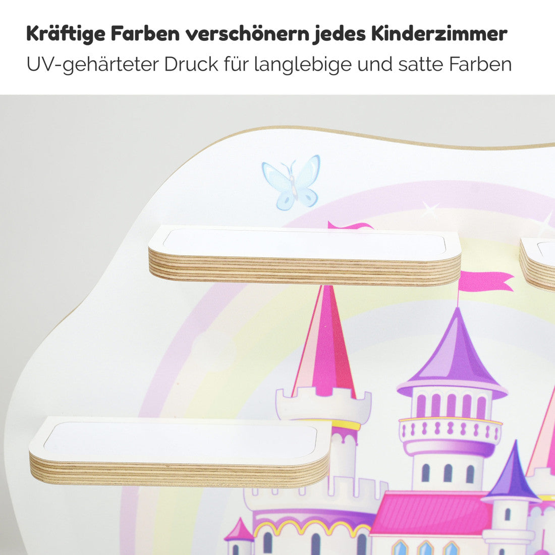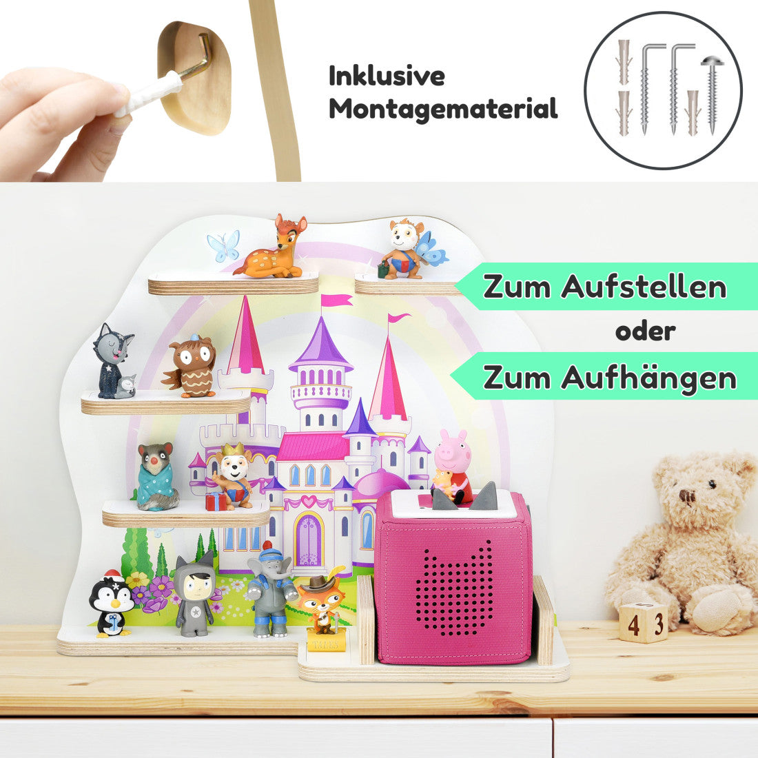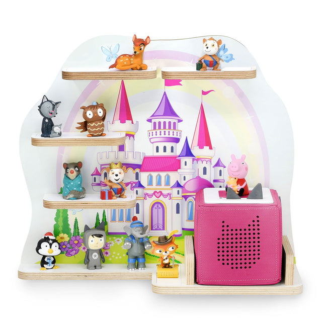 Das qualitativ hochwertigte und bedrucke Tonie / Toniebox Regal - Holzregal Schloss, mit viel Platz für Tonie Figuren.