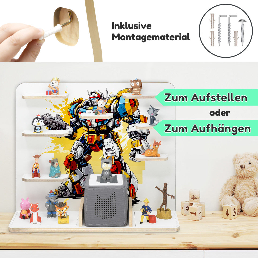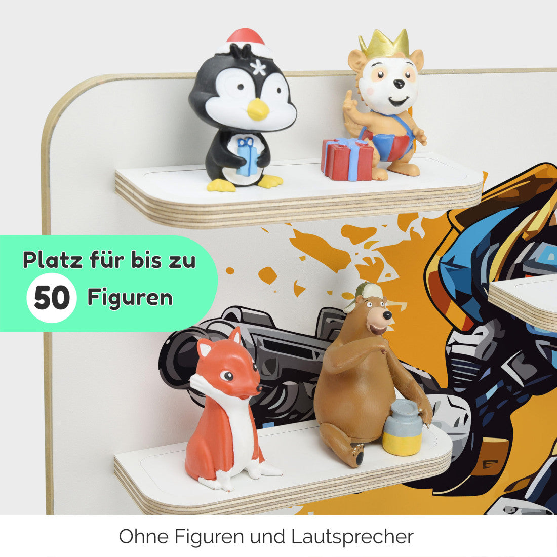 Das qualitativ hochwertigte und bedrucke Tonie Regal - Holzregal mit viel Platz für Tonie Figuren.