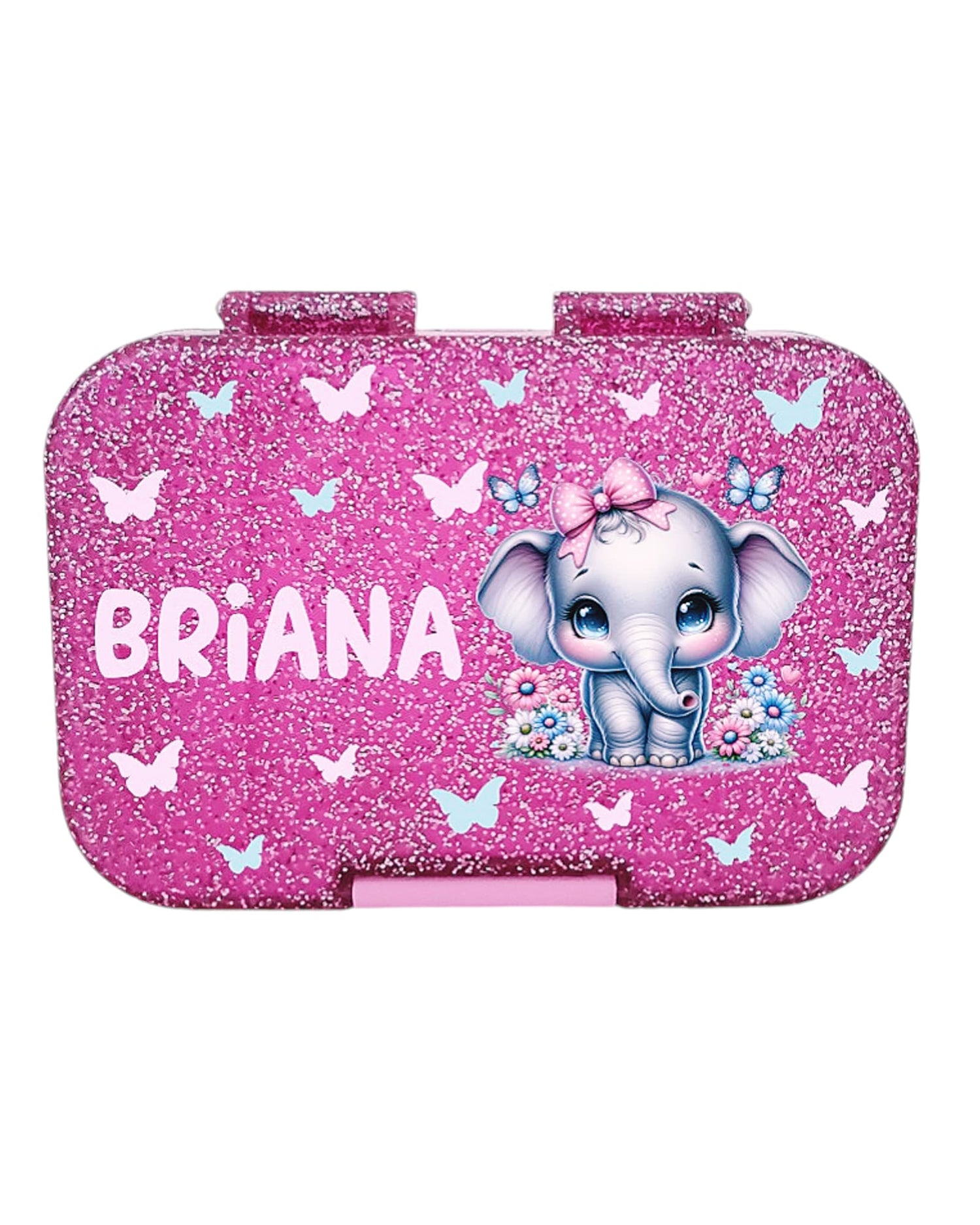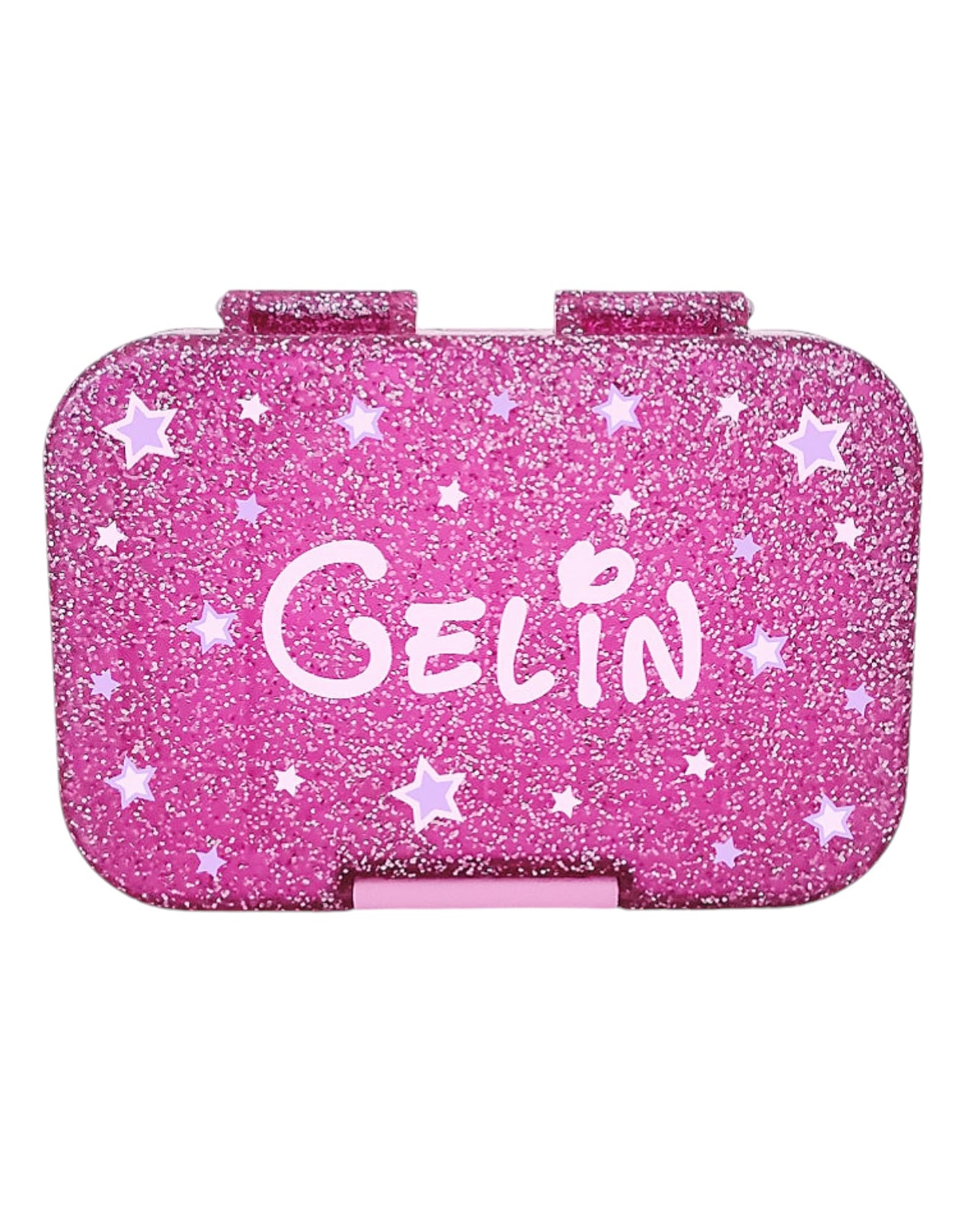 Die Znünibox Baurelia Box Mini Glitzer Pink kann mit Name oder nach Wunsch mit Motiv via UV-Druck bedruckt personalisiert werden.