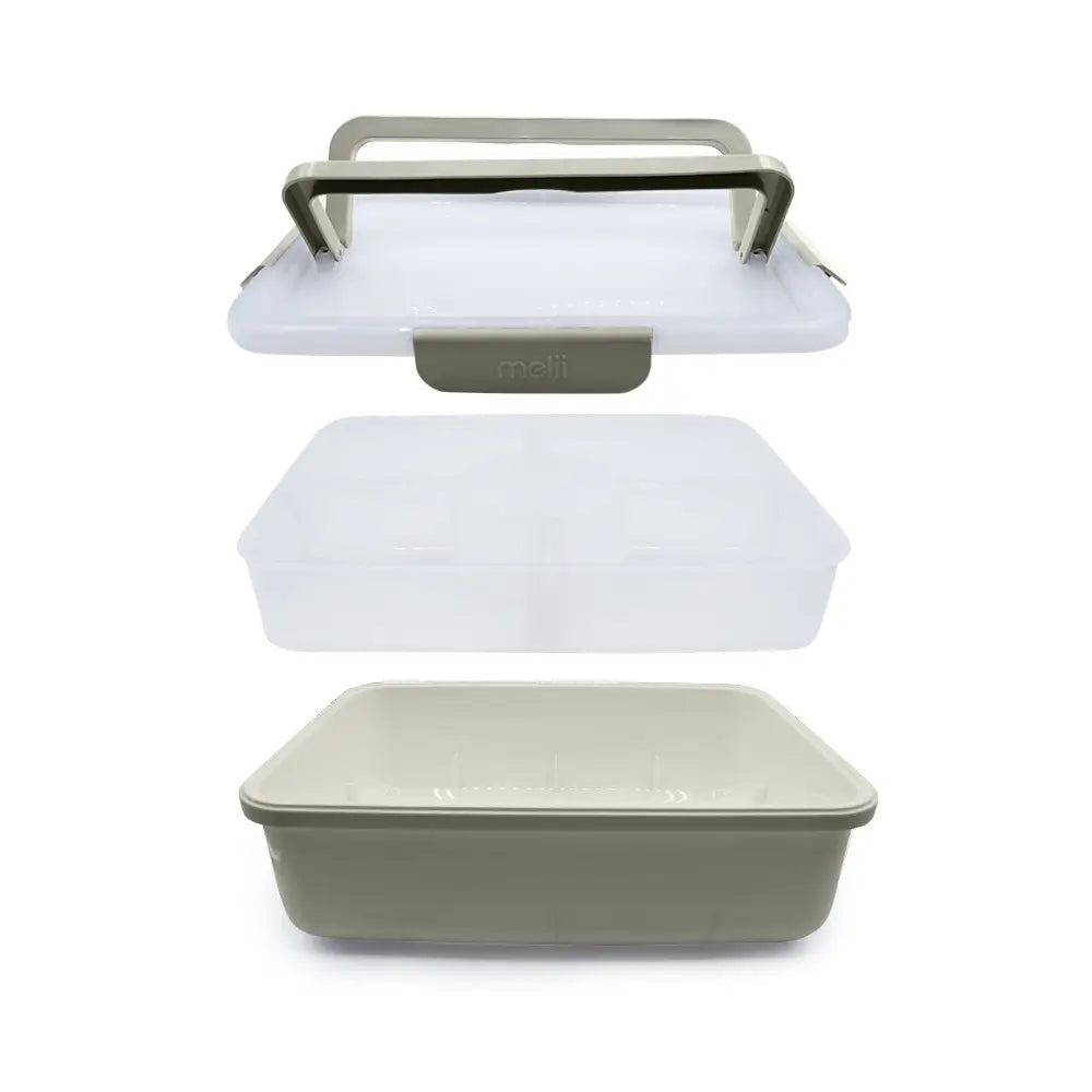 Leicht, aber dennoch langlebig, verfügt der Snackle Box Platter über einen Clip-Verschlussdeckel, der alles an Ort und Stelle sichert, sodass Sie ihn mit Zuversicht tragen können, während Ihr Essen frisch und sauber bleibt. Wir haben hier nicht aufgehört - dieses wiederverwendbare Serviertablett verfügt auch über ein einzigartiges unteres Aufbewahrungsfach. Perfekt zum Verstauen von Servietten, Tellern, Besteck oder sogar Kühlakkus!